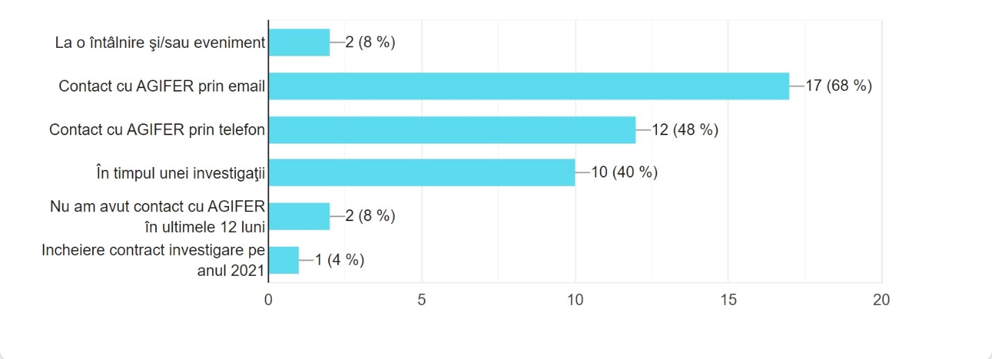 Cei mai mulți dintre respondenți au răspuns că au avut contact cu AGIFER prin email ( 17 răspunsuri) și telefon ( 12 răspunsuri), apoi cu ocazia derulării unei investigații. Cele mai puține răspunsuri au fost date pentru variantele: la o întâlnire sau eveniment și la încheierea contractului de investigare.